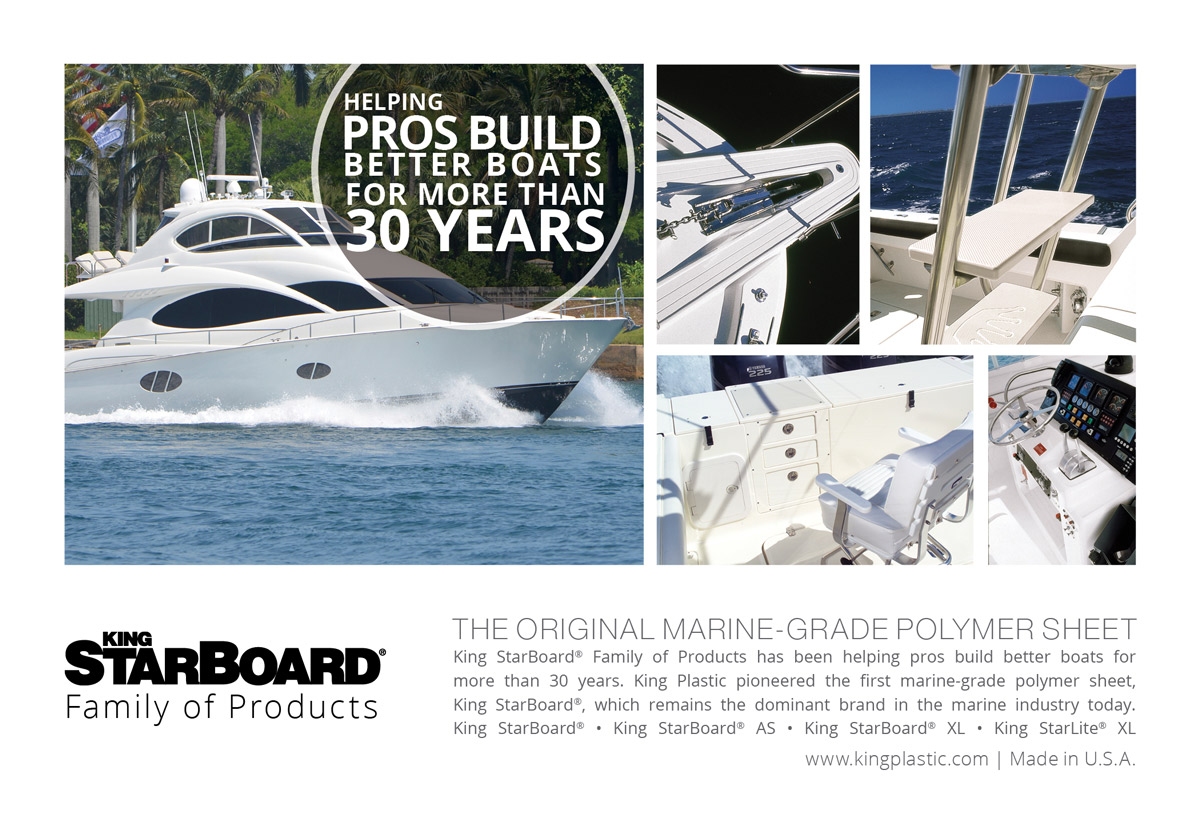 “We have been helping pros build better boats for more than 30 years,” said Michael Fabbri, National Sales Manager of King Plastic Corporation. “Some of the finest boat manufacturers around the world are using the King StarBoard® family of products to build superior quality boats and first-class luxury yachts.”